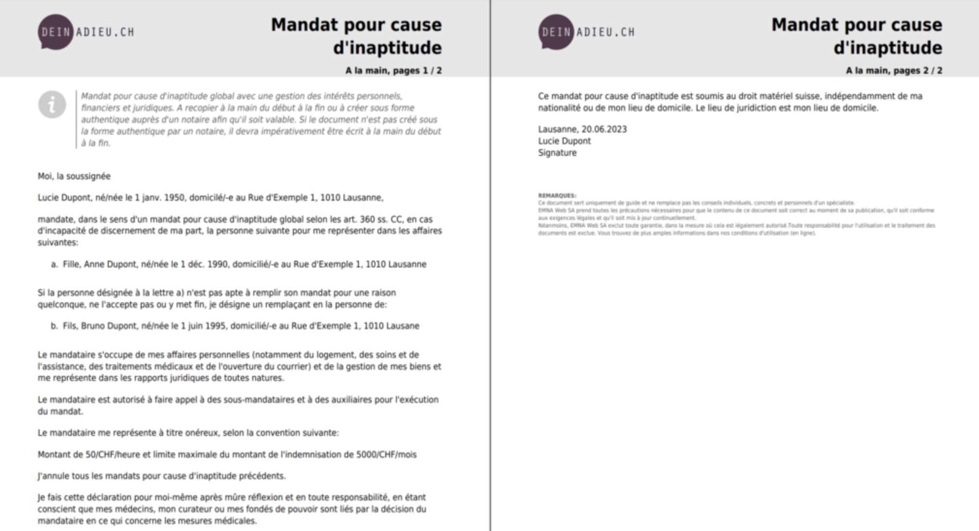 Toute personne souhaitant s’assurer une prise en charge et une représentation fiables pour le cas où elle deviendrait incapable de discernement devrait rédiger un mandat pour cause d’inaptitude. Dans cet article, nous vous montrons comment rédiger facilement votre mandat pour cause d’inaptitude sur DeinAdieu.