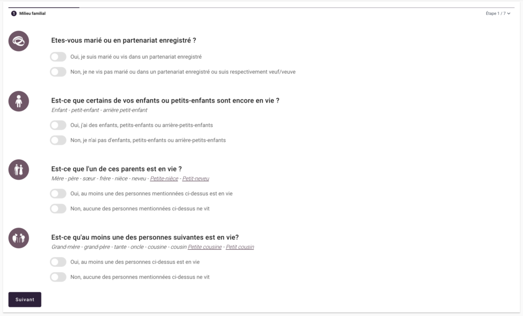 Pour calculer les réserves héréditaires, saisissez tous les héritiers légaux dans notre outil, de manière à vous assurer que votre testament est conforme aux exigences en termes de contenu.