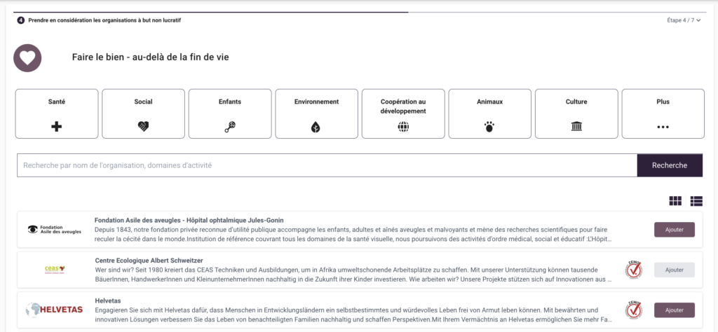 De même, un grand nombre d’organisations à but non lucratif dans toute la Suisse proposent des services de prévoyance vieillesse et de planification successorale. Leurs principaux avantages résident dans les services bon marché et à bas seuil qu’elles proposent ainsi que dans leur vaste expérience en matière de successions.