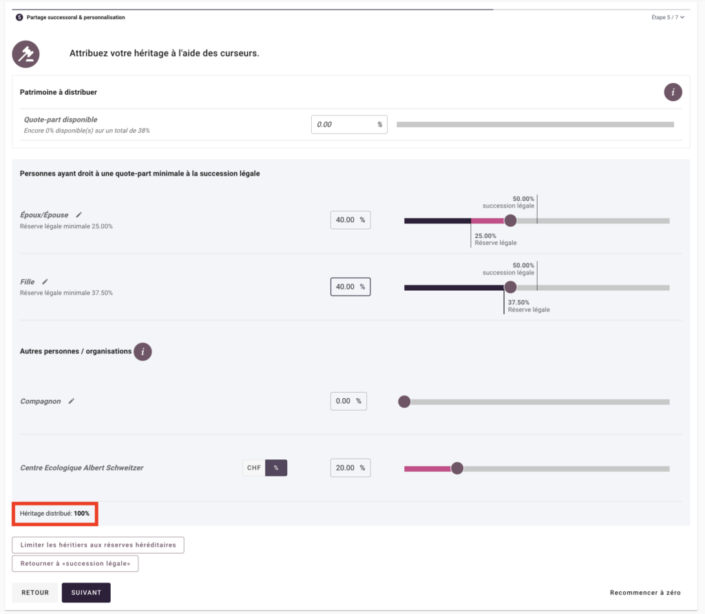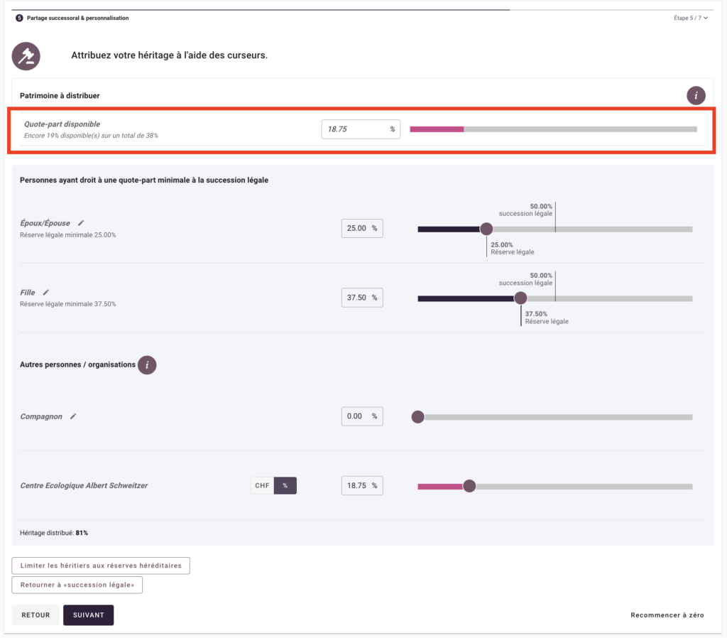 Vous pouvez alors définir vos préférences à l’aide d’un simple curseur. Notre outil vous aide à ne pas oublier les héritiers réservataires et à respecter leurs réserves héréditaires. Vous pouvez disposer librement de la quotité disponible – laquelle correspond à la partie de la succession qui n’est pas soumise à la protection des réserves héréditaires.