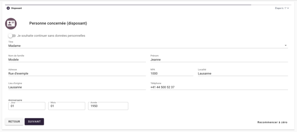 Si vous le souhaitez, vous pouvez saisir des informations personnelles avant la finalisation. Celles-ci sont automatiquement intégrées dans votre modèle de testament. Vous pouvez également continuer sans saisir des informations personnelles et les ajouter à la main plus tard lors de la transcription.