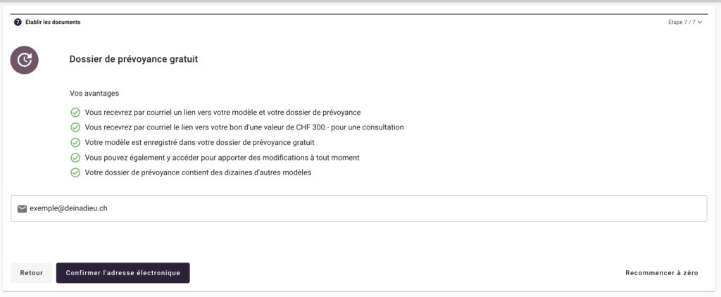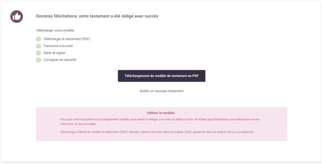 Dans la troisième étape, votre modèle de testament sera créé. Vous pouvez recevoir votre modèle de testament par courrier électronique, le télécharger au format PDF ou l’imprimer et l’étudier calmement.