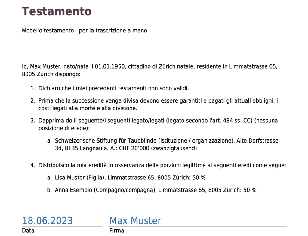 Io, Max Muster, nato/nata il 01.01.1950, cittadino di Zürich, residente in Limmatstrasse 65, 8005 Zürich dispongo: