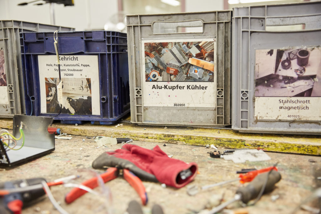 In der Recyclingwerkstatt wird vor allem Elektroschrott recycliert. Im Atelier stellen wir aus rezyklierten Materialien verschiedene Verkaufsprodukte her, die unter unseren beiden Labels recyclingArt und Lerski verkauft werden.